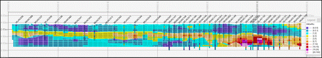 Figure 3. Drilling and model cross section 2 at 509150mN showing drilled and modelled HM%. (V.E. = 1:7)