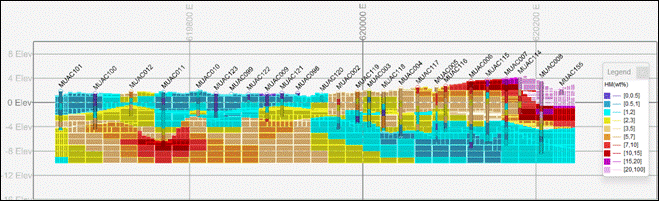 Figure 1. Proposed IMA MRE coloured by HM% and showing drill locations (V.E. = 1:7) Drill sections shown.