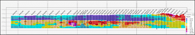 Drill hole collar elevations were then projected vertically to the DTM topographic surface. The drill hole file was zoned according to the geological interpretation wireframes in the same order of addition as applied to the model construction.