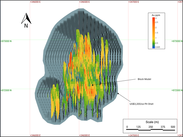 · The Mineral Resource extends over a strike length of approximately 900m, up to 700m width and to a maximum depth of 340m. To define the blocks with reasonable prospects of eventual economic extraction (RPEE) as required under the JORC Code (2012 Edition), the estimate has been constrained within a Lerchs-Grossman optimised pit shell generated in Datamine NPVS, using a gold price of