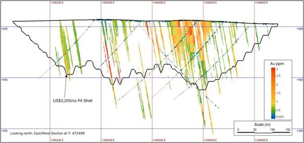 The grade-tonnage sensitivity analysis in Table 2 demonstrates the robustness of the MRE across a range of cut-off grades between 0.2g/t and 0.6g/t Au. Contained metal varies only modestly, indicating that the deposit is not overly sensitive to cut-off grade selection. Resource pit optimisation was also undertaken using a gold price of