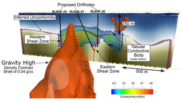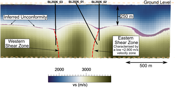 · Drillhole BL2026_03 is planned approximately 250m southwest of the collar of BL2026_01. This 500m long vertical hole is designed to test for uranium mineralisation at the apex of the Western Shear Zones, and along the shear zone itself, including its intersection with the unconformity.