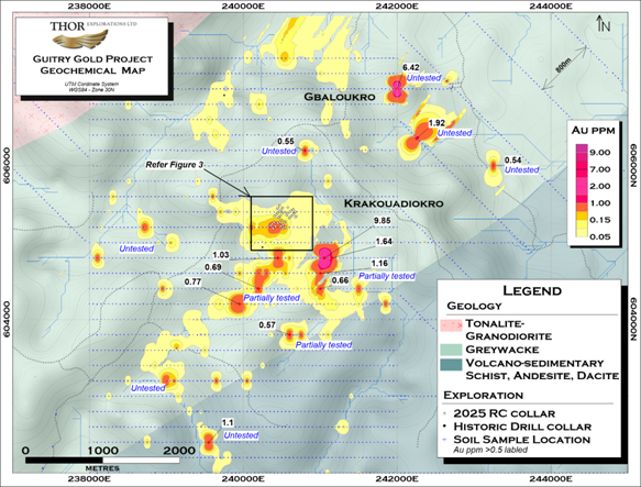 Thor has completed a total of 4,604 metres ("m") of reverse circulation ("RC") drilling at Guitry with the objective of gaining better understanding of both the geometry and geological controls on gold mineralisation.